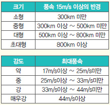 태풍의 분류 (크기와 강도)태풍은 크기와 강도에 따라 단계별로 분류한다. 크기 구분의 기준은 태풍 중심으로부터 초속 15m의 바람이 부는 반경, 즉 강풍반경이다. 강도는 중심부근에서의 최대풍속을 기준으로 한다.