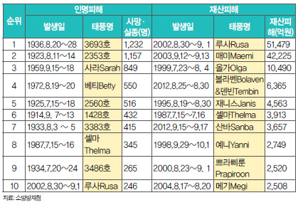 한반도에 가장 큰 피해를 준 태풍을 인명피해와 재산 피해로 나누어 보면 아래와 같다. 인명 피해는 근래 들어 비교적 줄어든 반면, 재산 피해는 커진 것을 알 수 있다. 이는 국가 경제 규모가 커진 것과 관련이 있어 태풍 자체의 위력과는 좀 다른 양상을 띠고 있다는 것을 알 수 있다.태풍과 관련된 기본 상식(1)