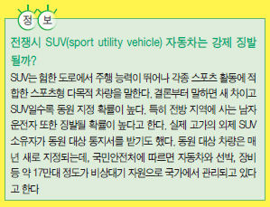 자동차 - 도시 탈출장비지진, 홍수, 화산폭발 같은 자연재해나 전쟁, 폭동 등이 일어난다면 눈앞이 아수라장이 될 것이다. 혼란이 단기간에 해결된다면 집에서 문을 닫고 그 동안 준비해둔 비상식량으로 버티는 것이 안전하다. 하지만 사태가 장기화된다면 적당한 기회를 봐서 도시를 빠져나가야 한다. 그런 면에서 자동차는 도시 탈출 장비로 가장 편리하다. 많은 사람들이 자동차에 의존해 이동하지만, 평소 의존도가 높은 제품일수록 충분한 사전 대책을 마련해두어야 한다.