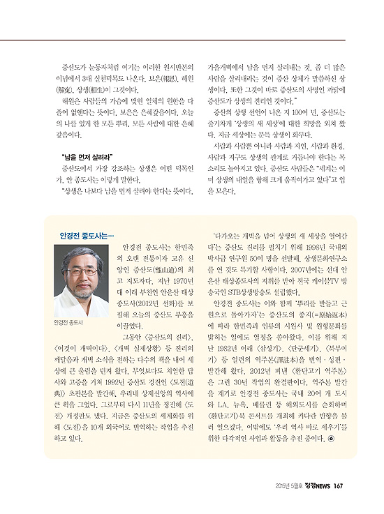 월간 <정경NEWS>는 2015년 5월호 민족종교탐방 코너에서 증산도 신앙문화와 안경전 종도사님에 대한 취재기사를 6면에 걸쳐 실었다. 본 기사에서는 140여 년에 이르는 연륜과 함께 한때 700만 도세道勢를 헤아리던 초기 역사 과정과 1970년대 이후 세 번째 개척으로 이룬 100만 도세의 오늘에 이르기까지 근세 이래 한민족 정신문화의 주요한 한 축을 이루어온 증산도의 역사를 소개하고 있다. 또한 산하에 매머드 연구기관(상생문화연구소)을 운영하고 경전인 도전道典을 10개 국어로 번역하며 STB상생방송을 설립해 전 세계에 ‘한(韓)문화’ 콘텐츠를 송출하는 등 세계를 무대로 활발한 활동을 펼치고 있는 증산도의 위상을 조감하고 있다. 특히 상생 정신의 연원으로 알려진 증산도가 세계를 향해 전하고 있는 원시반본原始返本과 개벽開闢 및 보은報恩, 해원解寃, 상생相生의 실천덕목에 대한 핵심 메시지를 알기 쉽게 전하고 있다.