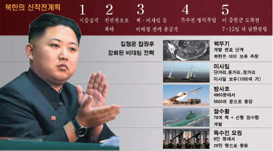 최근 북한이 7일 전쟁 계획을 세운 것으로 알려졌다. 김정은 국방위원장이 2012년 ‘당 중앙군위원회 확대회의’에서 신작전계획을 승인한 것으로 7일 안에 속전속결로 한반도에서 전쟁을 끝내려는 계획이다. 작전의 핵심은 기습남침을 하거나 국지전이 전면전으로 확전될 경우 미군이 본격적으로 개입하기 전인 7일 안에 남한을 점령하고 전황이 불리하더라도 최대 15일 안에 전쟁을 마무리한다는 작전이다. 이를 위해 비대칭 전력인 핵무기, 탄도미사일, 방사포, 잠수함, 특수전 요원 등으로 초반 기선을 제압한 후 재래식 전력으로 전쟁을 마무리하겠다는 것이다. 이는 90일 전쟁인 한미연합군의 작계5027을 무력화시키는 전략으로 섬뜩함을 느끼게 한다.