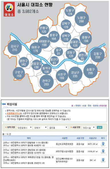 국가재난정보센터 민방위 코너에서 각 지역의 대피시설과 급수시설의 위치를 확인할 수 있다. 보통 아파트나 고층건물, 공공건물의 지하주차장 또는 지하실이 대피소로 이용되며, 급수시설은 학교나 공원, 병원, 아파트 등에 100~300톤 규모로 갖춰져 있다. 그러나 평소 구비해야 하는 비상식량과 통신설비, 방독면 등이 없거나 부족한 대피소가 많아 유사시 제 기능을 발휘할 수 있을지 의문이다.