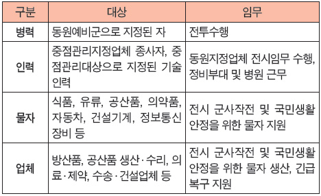국무총리 산하의 비상기획위원회에서는 국가비상사태 발생 시 인력과 물자의 효율적인 활용을 위한 비상대비업무를 총괄한다. 공격이 예상되거나 시작되면 국가비상사태가 선포되고 민관군이 총력 대응한다. 국가동원령이 선포되면 병력 인력 물자 장비 등을 동원하고 군의 전쟁 수행을 지원하게 된다. 또한 국민생활 안전을 위해 기본적인 생활필수품을 지정하여 유통을 통제하고 필요시 배급제를 실시한다.