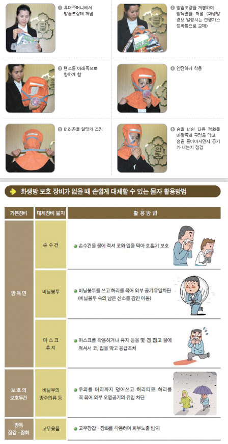 ㆍ화재 시 유독가스가 발생하면 방독면 착용 후 6분 이내에 오염지역을 벗어나야 살 수 있다.