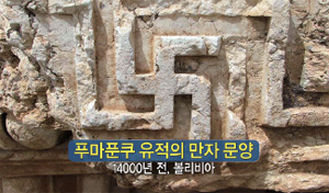 그 다음 이건 남미의 볼리비아에 있는 거예요. 현지에 가면 누구도 이것은 역사의 불가사의한 수수께끼다 하는 걸 절감합니다. 1만 4천년 전 푸마쿤푸 유적에 만 자 문양이 있어요.