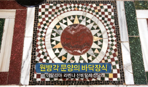 여기는 이태리의 북쪽 라벤나인데, 예전에 훈족이 여기를 들어갔어요. 거기 유명한 산비탈레 성당에 들어가 보면, 바닥을 전부 환국·배달·조선 이후 내려오는 동방의 원형문화, 동방 우주관인 원방각圓方角을 가지고 만들었어요. 바닥이 저걸로 아주 꽉 찼어요.