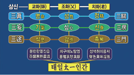 먼저 성명정이라는 영원한 세 가지 참된 것(삼진)을 삼관三關이라 하는데, 우주 진리의 문을 열려면 이 세 관문을 열어야 합니다.