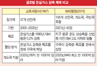 지난 12월 12일 프랑스 파리에서 열린 유엔기후변화협약 당사국 총회에서 195개 국가들이 만장일치로 온실가스를 줄이는데 합의한 ‘파리 협정(Paris Agreement)’을 채택했다. 1997년의 ‘교토 의정서’를 18년 만에 대체하는 새로운 기후협약 체제다. 교토의정서는 선진국 중에서도 온실가스 대량 배출국인 미국은 비준을 거부했고, 일본·캐나다·러시아·뉴질랜드 등이 잇따라 탈퇴하거나 기간 연장에 불참했다. 그러나 파리협정은 온실가스 배출 1, 2위인 중국과 미국은 물론 전 세계 국가의 실질적 참여를 이끌어냈다. 파리 협정은 선진국과 개도국 모두가 지키기로 합의한 것이라는데 큰 의미가 있다. 파리 협정은 온실가스 감축 목표를 일방적으로 할당한 교토 의정서와는 달리 회원국들이 자발적으로 실천 계획을 제출하는 방식이다.