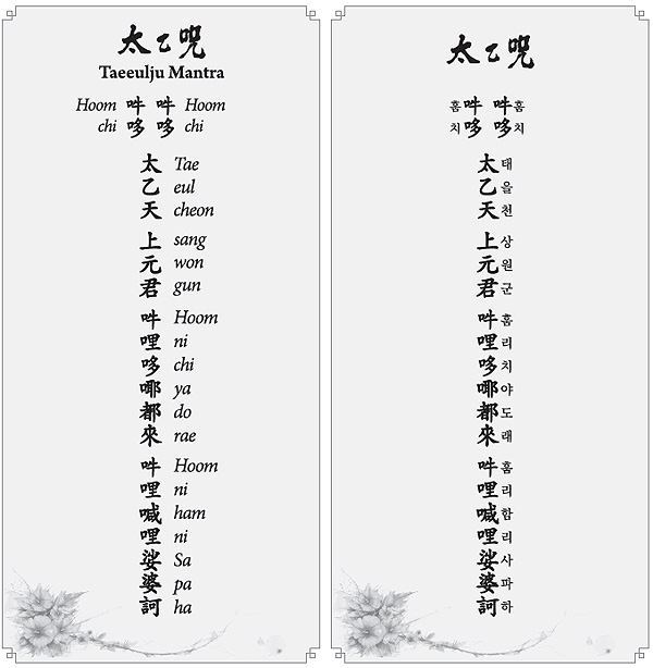 The Taeeulju Mantra is the most precious, mysterious and holy mantra in the 10,000-year human history. Chanting of the Taeeulju Mantra allows you to experience the divine light of the universe. By chanting the Taeeulju Mantra, you can reunite with your late parents and great parents. It protects you from all sorts of accidents.
