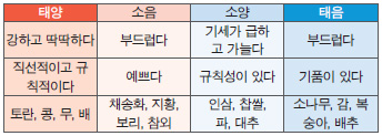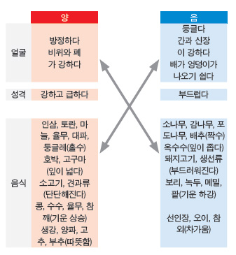 우리 몸에서 양의 작용을 하는 비위와 폐가 강한 양인은 기운이 위로 올라가기 쉽다. 그래서 음기가 강한 음식을 먹어야 편하고 기분이 좋다. 간과 신장이 강한 음인은 기운이 아래로 내려오기 쉽다. 그래서 양기가 강한 음식을 먹어야 소화가 잘된다.