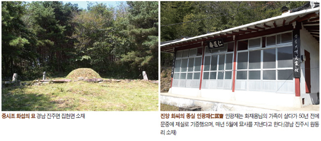 이후 화씨는 득성得姓 시조 이후 사성보첩賜姓譜牒을 잃게 되었다. 헌종 때 후손들이 안동부에 보존돼 있는 족보를 가까스로 찾아냈으나 원본이 크게 훼손되어 정확한 선계先系를 밝히지는 못하고 화명신의 6세손으로 알려진 화섭化燮을 1세조로 하여 세계世系를 잇고 있다. 화섭은 강월도 영월에서 중국 귀화인의 후손인 시柴, 마麻, 천千씨와 더불어 “선대의 고향에서 먼 곳에 와 있으니 고락을 함께 하자.”며 도원결의로 터를 잡고 살았다고 한다. 조선 선조 때 정유재란丁酉再亂이 일어났을 때 그는 원병 14만 명을 이끌고 온 명나라 마귀 제독을 만났다. 그는 마귀의 군막을 찾아가 “신주神州(중국)의 무신武臣 집단 후손인 나에게 병력을 주면 왜군을 무찌르는 선봉에 서겠다.”고 요청했다. 마귀는 화섭을 중군 선봉장으로 삼고 건주기병建州騎兵 1만8천 명을 거느리게 했다. 그는 명조의 무신 후예답게 이들 병력을 지휘, 울산에 포진한 왜군을 몰아내는 데 혁혁한 무공을 세운다. 이후 곳곳에서 왜군을 물리치는 등 전공을 세웠다. 1598년 7년간의 전쟁이 끝난 뒤 그는 선무일등공신宣武一等功臣으로 책록되고 영양英襄의 시호가 내려졌다. 우리나라에 건너와 가문을 연 이래 처음으로 조선의 훈신勳臣이 된 것이다. 전주 이씨를 아내로 맞았던 그는 전쟁이 끝난 뒤 경남 진양晋陽으로 옮겨 터를 잡았다. 그래서 진양 화씨가 되었다. 그곳에서 여생을 마친 중시조 화섭은 진양 땅 명석면鳴石面의 용장龍藏골에 묻혔다. 그의 외아들 화봉상化夆祥은 선대의 후광으로 가선대부嘉善大夫(종2품 품계)의 가자加資(조선 때 정3품 통정대부 이상 당상관의 품계)를 받았다. 진양 화씨는 임진왜란 때 화섭 외에도 화춘化春(2등공신), 화희성化希成(3등공신), 화연세化連世(3등공신) 등이 공신으로 책록되었다. 진양 화씨는 득관조 이후 안동 권씨, 파평 윤씨, 성산 이씨, 김녕 김씨, 연일 정씨, 창녕 조씨, 진양 강씨, 의성 김씨 등 영남의 명문거족들과 통혼通婚하여 학문과 도덕을 숭상하며 양반 가문의 전통을 굳혔다. 진양晋陽은 진주晉州의 옛 지명으로 1995년에 진양군이 진주시에 통합되어 오늘에 이르고 있다.