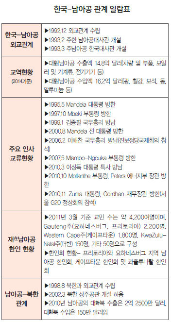 1994년 5월 남아프리카공화국에서 최초의 다인종 선거에 의한 흑인 민주정부가 수립된 이후 양국 관계는 급속히 발전해나갔다. 1995년 7월에는 넬슨 롤리랄라 만델라Nelson Rolihlahla Mandela 대통령이 한국을 방문했고, 2010년 11월에는 제이컵 게드레이레키사 주마Jacob Gedleyihlekisa Zuma 대통령이 주요 20개국 정상회담, 즉 G20(Group of 20) 서울회의를 계기로 방한했다. 이러한 고위급 인사들의 활발한 교류를 통해 양국 간에는 다양한 협력 모멘텀이 조성되고 있다.