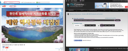 유튜브 동영상을 다운로드 받을 수 있는 프로그램이나 사이트가 여러 가지 있습니다. 그중에 ‘ClipConverter’라는 사이트를 이용해 보겠습니다. 1 먼저 유튜브에 들어가서 보고 싶은 영상을 선택합니다. 그러면 화면 맨 위 주소창에 해당 영상의 주소가 뜹니다. 2 그 주소를 블록화해서 복사해 둡니다. 3 구글 검색 창에 clipconverter.cc를 치고 해당 사이트로 이동합니다(http://www.clipconverter.cc). 4 복사해 둔 동영상 주소를 ‘ClipConverter’에 붙여넣기를 하고 continue를 누릅니다. 5 원하는 파일 형식(MP3, MP4 등)을 선택하고 start를 누릅니다. 6 download를 누릅니다.