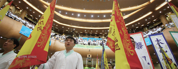 이윽고 봉행된 태모님 성탄대천제와 태을랑 발대식에서는 기수단이 입장하고 천지일월 네 분께 태을랑으로서 선서를 올리는 엄중하고 경건한 의식이 펼쳐졌다.
