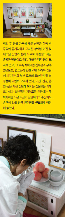 그 뿐인가. 세 단으로 나뉘어져 있는 신단 아래쪽 공간은 중앙에 미니 자개장이 고풍스럽게 놓여 있고 단주와 봉청수 도구들이 위치해 있다. 그 양 옆에는 도전과 환단고기 및 진리책 등 도서들과 홍보자료들이 단정히 진열되어 있다. 이 천신단에는 수시로 제물이 헌성되고 가족들의 기도와 주송이 이어진다. 정성스럽게 천신단을 조성하고 생활신앙으로 도방 문화를 이끌어 가고자 하는 가정도장 주인의 심성이 곳곳에서 드러나 보인다.
