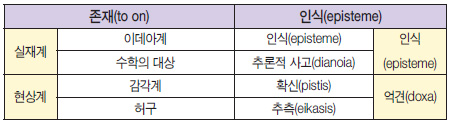 인간은 영혼의 활동으로 앎을 가지게 되는데, 플라톤이 전하는 앎의 대상을 구분해보자면, 크게 지성知性으로 알 수 있는 것들(ta noeta)과 감각感覺으로 알 수 있는 것들(ta horata)로 나뉜다. 전자는 통상 예지계睿智界, 즉 실재 세계에, 후자는 현상계現象界, 즉 그림자의 세계에 관여하는 것으로 알려져 있다. 실재의 세계는 다시 이데아와 수학의 대상으로 구분되는데, 이데아에 대한 앎은 인식(episteme)이고 수학의 대상에 대한 앎은 추론적 사고(dianoia)이다. 그림자의 세계 또한 감각으로 확인되는 것과 그렇지 않은 것으로 구분되는데, 감각을 통해 아는 지식은 확신(pistis)이고 감각으로도 확인되지 않는 허구에 대한 지식은 추측(eikasis)이다.