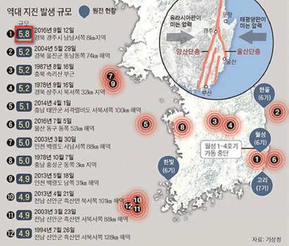 여기에 우리나라 역대 지진이 기록되어 있는데 올해 벌써 4.9 이상의 강력한 지진이 3번이나 발생했습니다. 5.8 지진은 1978년 이후 지진 관측 이래 처음 있는 일입니다. 강진이 2번 연속 일어난 것도 처음이고, 그리고 일주일 뒤에 4.5의 강한 여진이 발생했던 것도 처음입니다. 모든 것이 우리가 처음 겪는 일입니다.