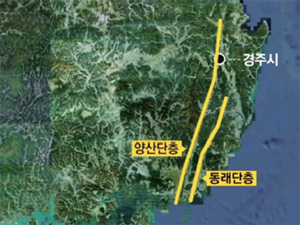 이것은 양산단층입니다. 이번 지진이 양산단층에서 일어났다고 하는 분이 있고, 그 옆에 있는 소규모 단층이라고 이야기하는 분도 있고, 지진대가 동서로 움직인다고 하는 분도 있어 의견이 분분합니다. 그렇지만 공통적인 것은 앞으로 6도이든 7도이든 또는 8.5도이든 더 큰 지진이 오는 것은 확실하다고 이야기한다는 점입니다.