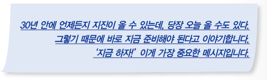 이 「도쿄 방재」 책의 맨 첫 페이지는 ‘30년 안에 70%의 확률로 발생할 것으로 예측되고 있는 수도 직하지진. 당신은 그에 대한 준비가 되어있는가’라고 시작합니다. 이러한 준비를 언제 할 것이냐? 30년 안에 언제든지 지진이 올 수 있는데, 당장 오늘 올 수도 있다. 그렇기 때문에 바로 지금 준비해야 된다고 이야기합니다. ‘지금 하자!’ 이게 가장 중요한 메시지입니다.