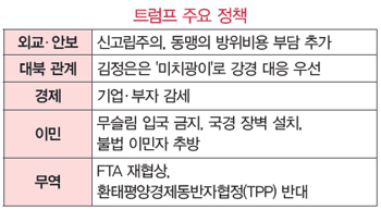 트럼프는 ‘미국 우선주의’와 ‘신고립주의’를 표방해 기존 외교정책의 전면 수정을 시사했다. 동맹국들에 대해서는 방위비 인상 요구와 함께 한미 FTA 등 자유무역협정의 전면 개정을 주장해 왔다. 또한 북핵 문제에 대한 대응에 있어서도 더 강경한 변화가 예상된다. 세계가 불안 속에서 그를 지켜보고 있다. 취임식은 내년 1월 20일 열린다.