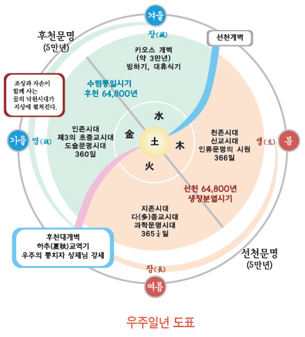 지나온 우주 봄여름철은 음양의 균형이 어긋난 상극相克 시대이다. 인간은 이 상극의 운을 타고 역사를 개척한다. 그 과정에서 필연적으로 크고 작은 원한과 척을 짓게 된다. 이 죄업에 대한 인과응보가 바로 병病으로 나타난다는 말씀이다. 그 누가 자연섭리로 닥쳐오는 천지병天地病을 피해갈 수 있겠는가.