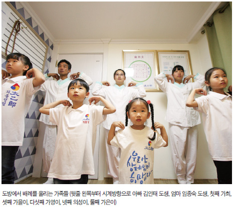 지난해의 마지막인 12월 말일을 이틀 앞둔 날 저녁, 취재진은 전주시 완산구 동서학동에 위치한 김인태, 임종숙 도생의 도방을 찾아갔다. 아파트 1층 가정도장 문 앞에 마주 서면 ‘STB상생방송’ 스티커가 큼직하게 붙어 있고 문을 열고 들어서니 집안으로 들어가는 내부 출입문 위쪽에 커다란 직사각형 목판에다 한자로 ‘가가도장家家道場’이라 새긴 팻말이 눈에 들어온다. 열린 문 앞에는 쪼르르 달려 나온 다섯 살배기 막내 가영이와 일곱 살 의성이, 열 살 가을이, 열두 살 가은이, 열일곱 가희의 얼굴이 보이고, 이들에 가려 뒷줄로 밀려난 아빠 김인태 도생, 엄마 임종숙 도생까지, 얼른 봐도 생동감이 넘쳐 나는 7인의 환한 모습이 취재진을 반갑게 맞아 주었다.