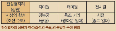 자미원에 기거하는 하늘의 제왕이 있으면 하늘의 신하도 있고 하늘의 백성도 있는 것이 당연한 이치이다. 하늘 임금 아래에서 우주 정치를 수행하는 정부기관이 있는 곳을 ‘태미원’이라 하며, 하늘 백성들이 사는 곳을 ‘천시원’이라고 한다. 이렇게 자미원, 태미원, 천시원은 삼원三垣이라 하며, 뒤에서 이야기할 28수와 더불어 동아시아 천문 사상의 특징이다. 즉 동아시아 천문도의 특징은 3원 28수이다. 조선을 만든 사람들은 하늘의 삼원을 지상에 배치시켰는데 자미원은 경복궁, 태미원은 육조거리로 지금의 광화문 광장에 해당한다. 육조 거리엔 중앙관청인 이조, 호조, 예조, 병조, 형조, 공조 이외에 조선 시대 국가 최고 의사결정기관인 의정부를 비롯하여 서울시청에 해당하는 한성부, 감사원격인 사헌부 외에 정부 중앙 관청인 6조가 있었다. 천시원은 현대적인 의미로 백화점과 쇼핑센터가 있어서 종로의 시전이 바로 천시원에 해당한다 하겠다.