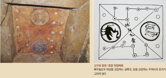 고구려 고분을 만들 때 방은 네모나게 천장은 둥글게 했으며 천장에 별자리를 그렸다. 이것은 ‘개천설’이라는 우주관이 투영된 무덤 건축 방식이다. 지금까지 발견된 고구려 고분들 중에 별자리가 그려진 고분은 25기이며 별의 개수는 총 800개에 육박한다고 한다.(김일권,『고구려별자리와 신화』,2009) 서기 357년에 만든 안악3호분에서 천장 별자리 벽화가 처음 발견되었다. 중요한 것은 천상열차분야지도에서 별의 밝기에 따라 별의 크기를 달리 그렸듯이 고구려 벽화에서도 역시 이러한 특징이 나타나고 있다. 덕흥리 고분의 북두칠성은 실제 별 밝기에 비례하여 그렸으며, 육안으로 구별하기 힘든 8번째 보성까지 그려 놓았다. 서기 590년경에 축조된 진파리 4호분에서는 전체 하늘을 한꺼번에 볼 수 있는 전천천문도가 천장 판석에서 발견되었다. 북한 학자들의 연구 결과를 보면 진파리 4호분의 별들은 6등급으로 구분하여 밝기를 표시했으며 총 136개의 별이 그려졌다고 한다. 중국 문헌에서 눈으로 볼 수 있는 별을 다 그린 전천천문도가 등장하는 시기는 8세기 정도이지만 고구려에서는 이미 6세기에 전천천문도가 고분벽화로 등장한다. 고구려의 전천 천문도는 바다 건너 일본에서도 발견되었다. 일본 나라(奈良)현 아스카 지역에서 1998년에 발견된 키토라 고분에서 고구려 천문도가 발견되었다. 무덤 천장에는 해와 달 그리고 28수의 별들이 고구려 무덤 양식대로 빼곡히 그려졌고, 진파리 4호분 천장 별자리처럼 별들을 금박金箔으로 그렸다. 천상열차분야지도와 유사한 기토라 무덤이 만들어진 시기는 7세기이지만 별의 관측 장소는 북위 39도 평야 지역이며 관측 시기는 기원전 300년에서 기원후 300년 사이로 밝혀졌다.