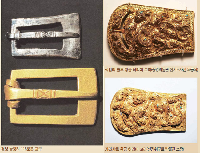 낙랑국 황금 허리띠 고리와 가장 많이 비교되는 황금 허리띠 고리는 신장위구르 카라샤르에서 발견된 1∼2세기 황금 허리띠 고리입니다. 신장위구르자치구박물관이 소장하고 있으며 2008년도에 중앙박물관에서 전시되어 한국에 소개되었습니다. 제작기법과 소재가 낙랑국 허리띠고리와 아주 유사합니다. 다른 점이 있다면 큰 용이 한 마리 작은 용이 7마리로 용이 모두 8마리가 표현되어 있습니다. 용의 등 부분을 표현하는 부분이 낙랑 것에 비해 다소 투박스러워 장인들의 예술적 기술적 수준 차이가 확연합니다.