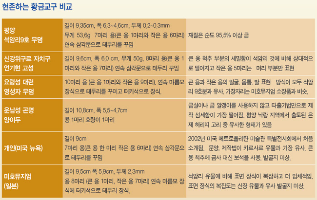 몽골 북부 노용 올Noyon-Uul 20호분에서는 단조 타출기법으로 제작된 은제 장식판이 발견되었습니다. 여기에서 발견된 장식판에도 두 마리 용이 마주보고 있는 모양이 있습니다. 용은 돼지 코를 닮은 코와 긴 수염, 두 개의 뿔과 한 쌍의 날개를 가지고 있습니다. 코를 과장되게 묘사하고 두 개 뿔을 가진 용의 얼굴, S자형을 이루고 있는 몸통과 발톱을 지닌 다리 형상 등 석암리 9호분 금제교구 용 형상과 매우 유사합니다. 노용 올에서 발견된 은제교구에는 이리 혹은 늑대와 비슷한 용의 모습이 나타나 있습니다. 곤명 양이두 금제교구에서도 이 특징이 보입니다. 몽골 흉노 고분(노용 올 20호분, 골 모드 20호분)에서는 감입기법도 확인되고 있습니다. 금사와 금립을 붙여서 난집을 만들고 그 안에 터키석을 감입한 장식품도 발견되었습니다. 몽골 흉노 시대 분묘에서 주요 제작 기법(타출, 누금세공, 감옥)이 모두 확인됩니다.