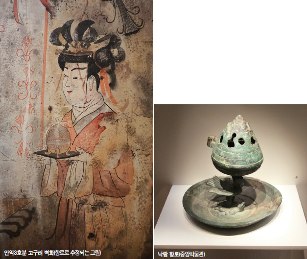 봄에 공원이나 들판에 나가면 화사한 꽃들이 만발합니다. 향기로운 꽃내음이 사람을 기분 좋게 만들어 줍니다. 이렇게 향기를 즐기는 생활은 아마도 인류가 지구상에 문명을 건설하기 이전부터 시작됐으리라 생각됩니다. 향기는 상고 시대로부터 주요한 정치적인 요소였습니다. 제왕이나 고위 귀족이 행차할 때는 향로를 든 사람이 앞서 걸어가며 고급스러운 향기를 피워 내어 고귀함을 과시했습니다. 제왕이나 귀족의 공식 행사를 할 때면 어김없이 귀한 향을 피워 엄숙함과 정갈한 분위기를 지어냈습니다. 경복궁 근정전 좌우에도 거대한 세 발 향로가 자리하고 있는 것으로 볼 때, 조선 시대까지도 정치 행사에 이러한 향기가 활용되었다는 것을 알 수 있습니다. 안악 3호분 고구려 벽화에도 한 여성이 새 모양이 장식된 향로를 받쳐들고 있는 장면이 있습니다.