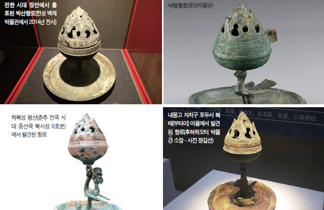 원형으로 향반(향로 받침대)이 있고, 산 모양의 향로 본체를 날개와 꼬리를 펼친 새가 머리로 받들고 있습니다. 이 향로 머리 부분의 형태를 가리켜 “박산博山”이라고 부릅니다. 정말 안타깝게도 이 향로 본체 모양 때문에 석암리 향로를 낙랑군(한사군) 유물로 취급합니다. 그 이유는 진한秦漢 유적(기원전 3세기 말)에서 산 모양 향로가 발견되어 학자들이 “박산향로”라고 이름 붙였기 때문입니다.