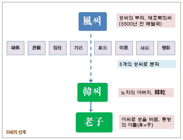 노자에 대한 최초의 공식적인 기록은 사마천의『사기』 「노장신한열전老莊申韓列傳」이다. 노자의 신원에 대해 “성은 이씨이고 이름은 이, 자는 담이다[姓李氏, 名耳, 字聃]”라고 기록하였다. 노자는 초楚나라 고현苦縣의 여향厲鄕 사람으로 주周나라 수장실守藏室의 관리였는데, 공자가 노자를 찾아가 예를 물었다고 한다. 노자가 함곡관函谷關[중국 허난성(河南省) 북서부에 있어 동쪽의 중원中原으로부터 서쪽의 관중關中(陝西)으로 통하는 관문關門]을 지나면서 써 준 ‘자기동래紫氣東來’ 문구는 동방 천자 문화의 종주가 동방 고조선인임을 천명한 역사적인 명문이다. 노자의 혈통에 대해 『환단고기』와 『신교총화』에서는 노자는 원래 동방의 시원 족속인 풍이족 출신으로 한韓씨인데 나중에 ‘동방의 아들(李=木+子)’이란 뜻으로 이씨로 바꾸었다고 한다. 이것은 노자가 본래 동방 신교 문명의 정통을 계승한 자랑스러운 한민족임을 암시한다.