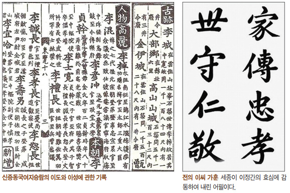 이정간李貞幹은 천仟의 현손이며 언충彦沖의 재종손으로, 세종世宗 때 강원도 관찰사를 재임하였다. 하지만 노모 봉양이 힘들자 관직을 사퇴하기도 했다. 또 나이 80세였을 때 100세인 노모를 즐겁게 하기 위해 색동옷을 입고 병아리를 희롱하였다고 한다. 이를 전해 들은 세종이 그의 벼슬을 정2품으로 올리고 사연賜筵과 궤장几杖을 하사하였다. 그가 죽음에 임박했을 때, 세종이 ‘가전충효세수인경家傳忠孝世守仁敬’이라는 어필御筆을 내렸는데, 전의 이씨 문중에서는 이 문구를 가훈으로 전하고 있다. 전의 이씨는 우리나라의 주요 문벌로 이름을 떨쳤는데, 조선에서만 문과 급제자 178명, 상신 5명, 대제학 1명, 청백리 6명, 공신 6명을 배출하였다.