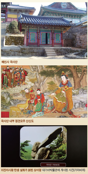 합천에 가면 가야면에 가야산이 있습니다. 산 이름이 가야산입니다. 왠지 가야에 대한 이야기가 전해져 올 것 같지 않습니까? 실제로 가야산은 가야 건국자 탄생에 얽힌 설화를 품고 있습니다. 가야산에는 ‘해인사海印寺’라는 유명한 사찰이 있는데, 해인사 안에는 “국사단局司壇”이란 사당이 있습니다. 국사단은 산신과 토지신을 모시는 사당입니다. 이 사당 안에는 탱화가 하나 주인 자리를 차지하고 있습니다. 한 여인이 두 아이가 노는 모습을 바라보고 있고, 그 모습을 구름 탄 이들이 지켜보고 있습니다. 이 그림 속 여인이 누구일까요? 조선 시대 「신증동국여지승람新增東國輿地勝覽」에는 해인사 경내에 조선 시대 정견모주正見母主를 모시는 사당인 정견천왕사正見天王祠가 있었다고 합니다. 지금은 전해지고 있지 않는데, 정견천왕의 다른 이름이 정견모주입니다. 정견천왕 혹은 정견모주는 바로 가야산 산신입니다. 그런데 이 산신은 건국 설화 속 주인공이기도 합니다. 「신증동국여지승람」에 전하는 이야기로는 이진아시왕(대가야 건국 왕)의 어머니이자 김수로왕의 어머니가 바로 정견모주입니다.