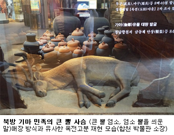 합천 박물관 전시실에는 옥전고분 하나를 재현해 놨습니다. 그 재현한 무덤실 안에는 다른 고분에서 흔히 보지 못했던 장면을 만나게 됩니다. 큰 뿔 사슴이 한편에 놓여 있습니다. 흉노 등 기마유목 민족 무덤에서는 큰 사슴이나, 뿔 염소 혹은 염소 뿔을 씌운 말 들이 같이 매장됩니다. 그런데 놀랍게도 옥전 고분에서도 이렇게 큰 뿔 사슴이 같이 매장됐습니다. 북방 기마민족의 매장 문화가 가야 고분에서 나타나는 것은 어떤 의미일까요?