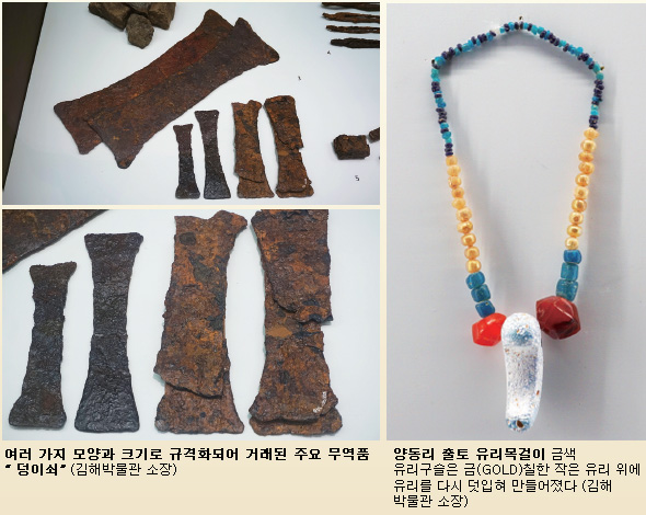가야에 금은金銀 유행이 시작되기 전에는 유리옥이 대표적인 귀중품이었습니다. 김해 양동리 유적은 넓이만 3만여 평(미터법으로 환산)에 이르는 대규모 가야 유적 단지입니다. 양동리에서는 여러 가지 색깔의 크고 작은 유리옥과 금박을 입힌 유리옥들이 다량 발견되었습니다. 이 유물들이 김해박물관의 한편을 장식하고 있습니다. 먼저, 가야의 ‘글로벌Global’ 대외 교역을 드러내 주는 ‘로만글라스’부터 이야기해 볼까 합니다.