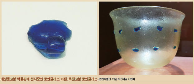 2013년도 국내에서 가장 오래된 ‘로만글라스(로마 양식의 유리 용기)’의 일부분(파편)이 김해시에서 출토됐습니다. 대성동 91호분(4세기로 추정)에서 발견된 로만글라스 파편은 도굴 갱에서 발견됐습니다. ‘도굴 갱’이란 도굴꾼들이 무덤 속 유물을 가져가기 위해 파 놓은 굴입니다. 안타까운 일이죠. 온전한 로만글라스가 발견됐다면 경주에서 발견된 것보다 최소 70년 앞선 유물이었을 텐데. 이후에 다시 합천에 있는 옥전고분(M1호분)에서 온전한 로만글라스가 발견됩니다.
