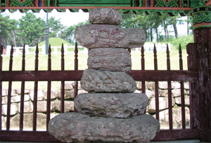 국사단 탱화 말고도, 가야산에는 천신天神과 지신地神이 결합했다는 전설이 얽힌 바위가 있습니다. 가야산 백운리에서 칠불봉으로 올라가는 길 서성재 남쪽에 넓적한 바위가 걸쳐 있는데, 가야산 국립공원에서 부르는 공식적인 이름은 ‘서장대’입니다. 현지에서는 ‘가마바위’ 또는 ‘상아덤’이라 불리는 이 바위는 정견모주가 천신인 “이비가夷毗訶”를 맞이할 때에 탔던 가마라고 전승되고 있습니다.