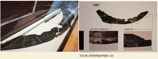 앞서 살펴본 허왕후 설화를 보면 인도와 동남아로부터 바닷길로 김해에 이른 사람들이 있었습니다. 삼국유사 기록으로 보면 허왕후가 타고 온 배에는 대략 40~50명이 승선한 것으로 보입니다. 가야 사람들은 이런 항해를 할 수 없었을까요? 그 궁금증에 대한 길을 열어준 유물이 2012년에 김해 봉황동에서 발견되었습니다. 이 유물은 배 일부분(이후 ‘선박 부재’로 명칭)입니다. 이 선박 부재는 길이 390cm, 폭 32~60cm, 두께 2~3cm인 꽤 큰 크기입니다. 온전한 배 전체 모습으로 발견됐으면 좋겠지만 천 년이 넘는 시간을 뛰어넘어 이 정도 크기로 남아 있는 것도 기적일지 모르겠습니다.