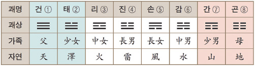 [#팔괘에서 간艮괘와 태兌괘는 각각 소남과 소녀에 해당합니다. 팔괘를 한 가족으로 배속할 때 건곤乾坤괘는 부모가 되고, 진震괘와 손巽괘는 장남과 장녀가 됩니다. 감坎괘와 이離괘는 중남과 중녀가 되고, 간괘와 태괘는 막내인 소남과 소녀가 됩니다. 방위로 보면 동북 간방에 위치한 한반도는 간소남이 되고, 미국은 서방 태소녀가 됩니다. 그런데 간소남과 태소녀가 합덕하여 선천을 매듭짓고 후천을 엽니다. 이것은 우주가 변화하는 이치, 즉 대자연 섭리입니다. - 증산도의 진리#}