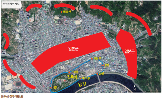 진주대첩의 전투 상황은 김성일의 장계(난중잡록 2, 임진 10월 10일)에 의거하여 재구성하였다.[주6]