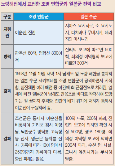 노량해전에서 교전한 조명 연합군과 일본군 전력 비교