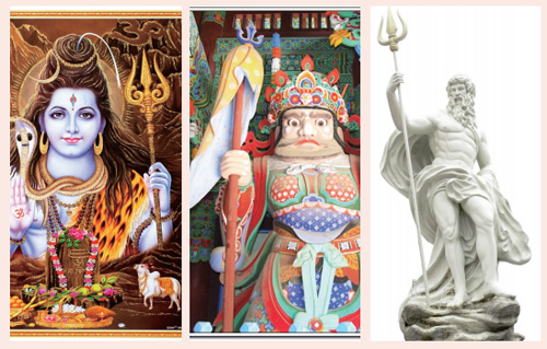 세계 각국의 신화에 나오는 신들 중에는 삼지창을 자신의 병기, 신물로 삼고 있는 신들이 있다. 인도 신화의 파괴신 시바Shiva 또한 트리슈라Trishula라는 삼지창을 무기로 삼고 있으며, 불교의 비사문천毘沙門天도 종종 삼지창을 들고 있다. 우리나라에서는 군졸들이 관아의 정문을 지킬 때 들고 있는 무기로 연상된다.