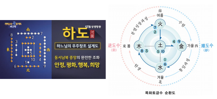이것은 인류 최초의 계시록 천부경을 그림으로 그려 놓은 하도河圖이다. 하도는 우주 창조의 설계도이자, 우주가 개벽하는 원리를 담고 있다. 이 하도의 북방에는 1·6(水)이 있다. 북방 1·6水는 만물을 낳는 생명의 근원이 되는 태극수太極水이다. 하늘은 양이고 땅은 음으로, 1수는 양수고, 6수는 음수다. 이 천지의 생성수 1·6수를 합하면 7화火다.