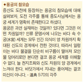 “상제님도 용궁을 다녀오셨다. 우리가 수행을 통해 바닷속 용궁에 들어가면 어떻게 되는가? 바닷속이 마치 공기처럼 느껴진다. 바닷속이 꼭 이 공간에서 땅 위에서 숨을 쉬고 있는 것과 똑같은 느낌이란 말이다. 이렇듯 바닷속에도 신의 세계가 존재하는 것이다. 상제님은 우주의 주재자이시면서 동시에 신도의 주재자이시다.” - 종도사님 말씀