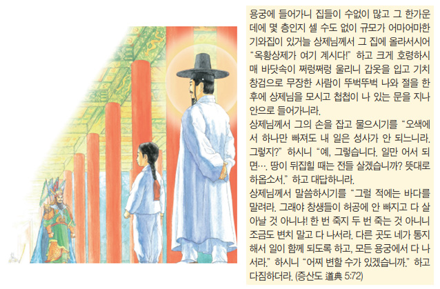 상제님을 따라 용궁의 충격적이고 경이로운 장면을 보고 나온 호연은 놀랍고 신기하여 “우리가 저 속에 들어갔다가 나왔네” 한다.