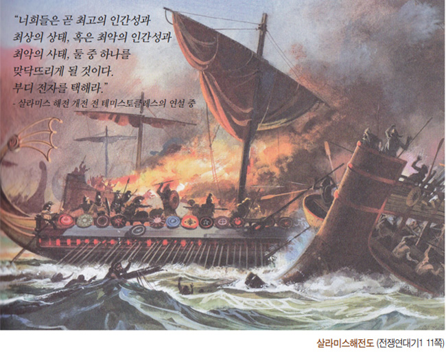 아테네에 무혈 입성한 크세르크세스는 아테네 수호신인 아테나 신전을 비롯한 모든 신전에 불을 지르라고 명령했다. 아크로폴리스 언덕 전체가 불타오르는 모습을 아테네 시민들은 배 갑판 위에서 지켜보았다. 이제 배수진뿐이다. 아군까지 궁지에 몰아넣은 테미스토클레스는 더 강수를 두었다. 전투를 앞두고 갑론을박하며 서로 분열되어 있던 그리스 연합수군을 역사적인 해전으로 끌어들였다. 그리스가 겁을 먹고 도망가니 가는 길을 막기만 하면 페르시아가 승리할 거라고 정보를 흘린 것이다. 탁상공론만 하던 그리스 연합군 수뇌부 앞에 페르시아 해군이 모습을 드러냈다.
