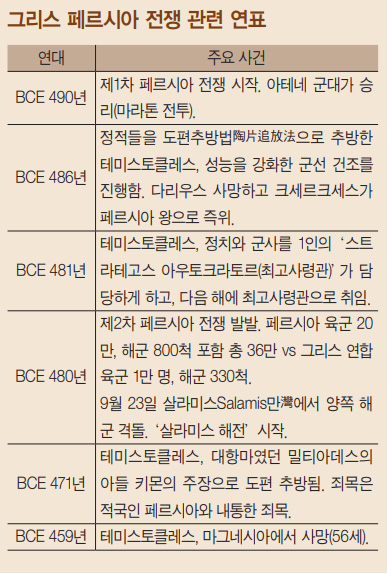 BCE 480년, 페르시아 제국의 왕 크세르크세스가 친히 이끄는 페르시아의 대군은 다시 그리스 원정에 나섰다. 페르시아 해군은 폭풍과 그리스 해군의 저항으로 고전한 반면, 페르시아 육군은 영화 ‘300’의 배경이 된 테르모필레 전투에서 스파르타를 위시한 그리스 연합군을 궤멸시키는 전과를 올렸다. 아르테미시온에서 페르시아 해군과 일진일퇴를 벌인 테미스토클레스는 전투의 결과를 보고받았다. 테르모필레를 돌파한 페르시아 군대의 남하를 막을 방법은 없었다. 이제 승부는 바다 위에서 내야 했다. 테미스토클레스는 그리스 연합해군을 살라미스Salamis만灣으로 이동하라고 명령했다. 육지에서 맞서 싸우는 것은 불가능하다고 보아 아테네 시내에 사는 사람들을 강제적으로 이동시켜 시내를 텅 비게 만들었다.