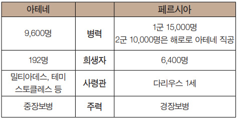 완전 무장한 아테네의 중장보병을 ‘호플리테스’라고 한다. 중장보병이 8열로 서서 오른손에 창을 왼손에 방패를 들고 왼팔 팔꿈치로 옆 병사의 자세를 받쳐 줌과 동시에 방패로 함께 보호하며 방어력이 탁월한 밀집 대형을 갖추니 이른바 ‘팔랑크스’ 대형이었다. 팔랑크스는 철옹성과 같아서 어떤 군대도 격파하기 힘들다. 서로의 몸을 밀착시킴으로써 강한 연대감 속에 적을 향해 오직 전진만 할 뿐이다. 옆의 전우에 대한 철저한 신뢰감과 더불어 자신의 위치를 철저히 고수하면 되었다.